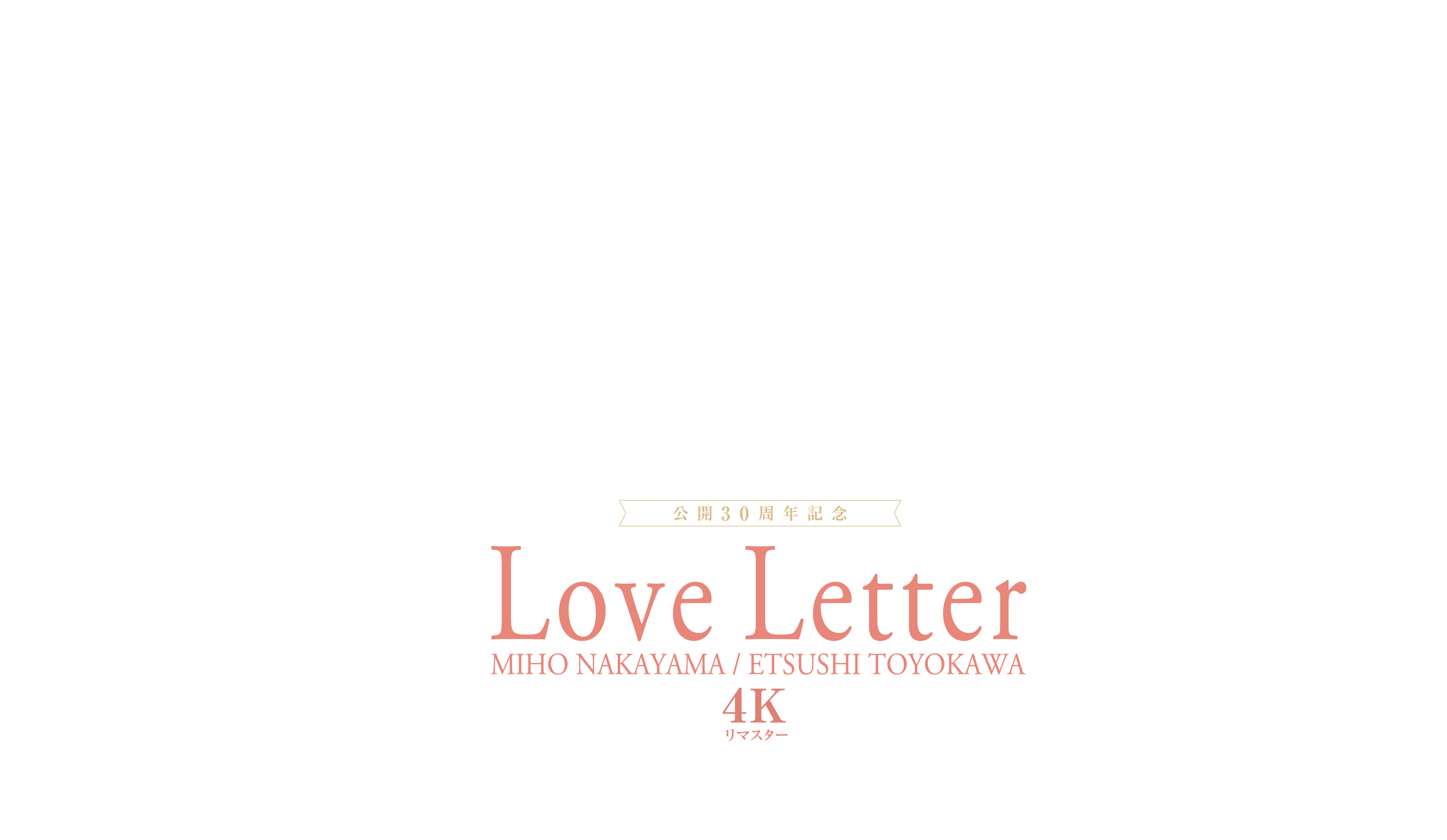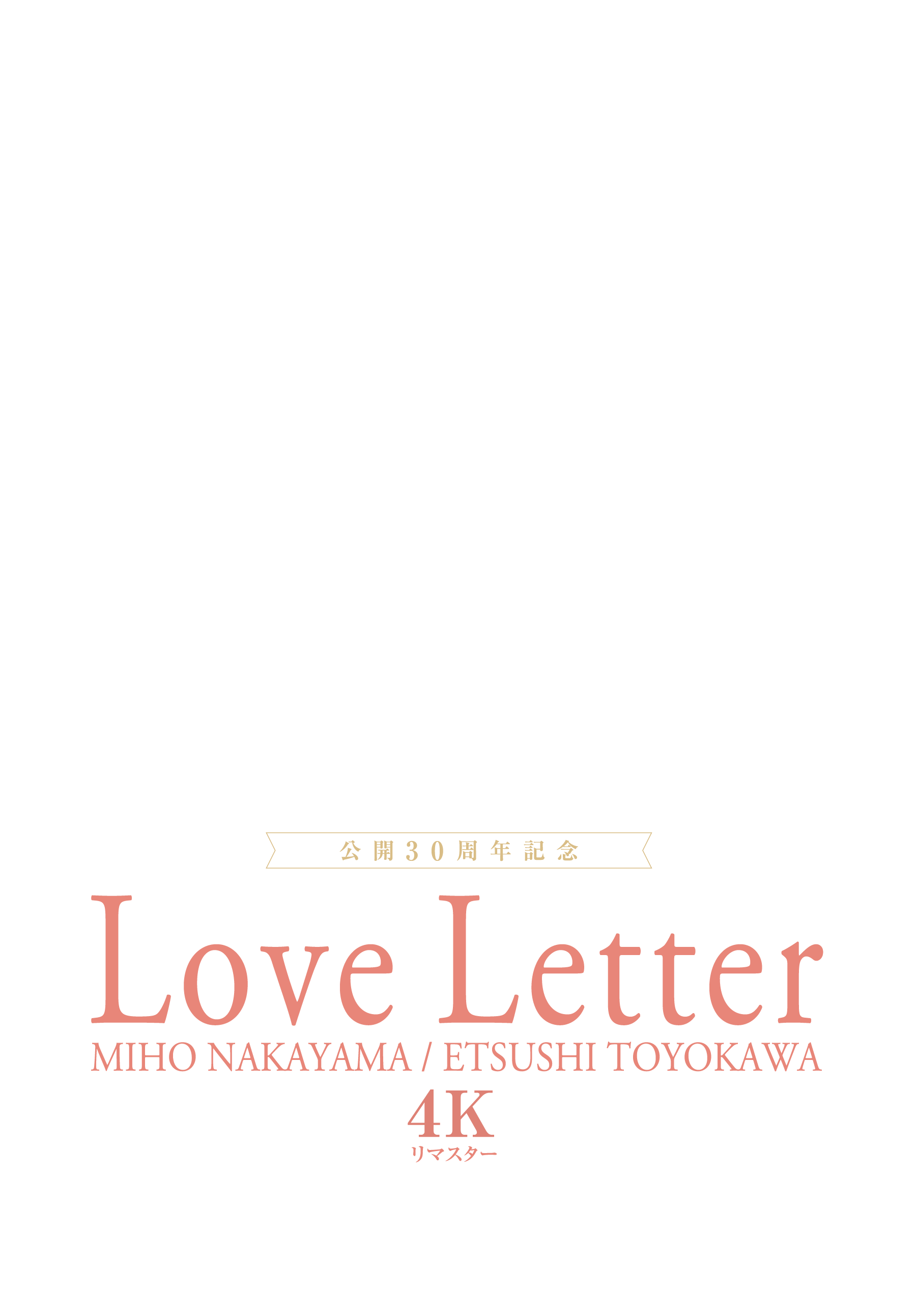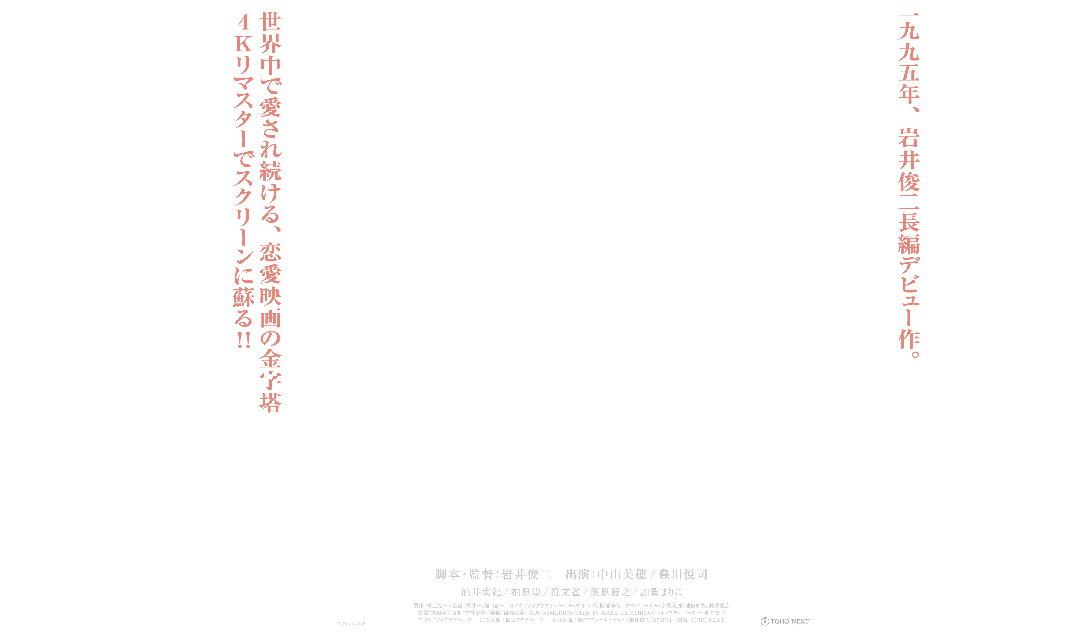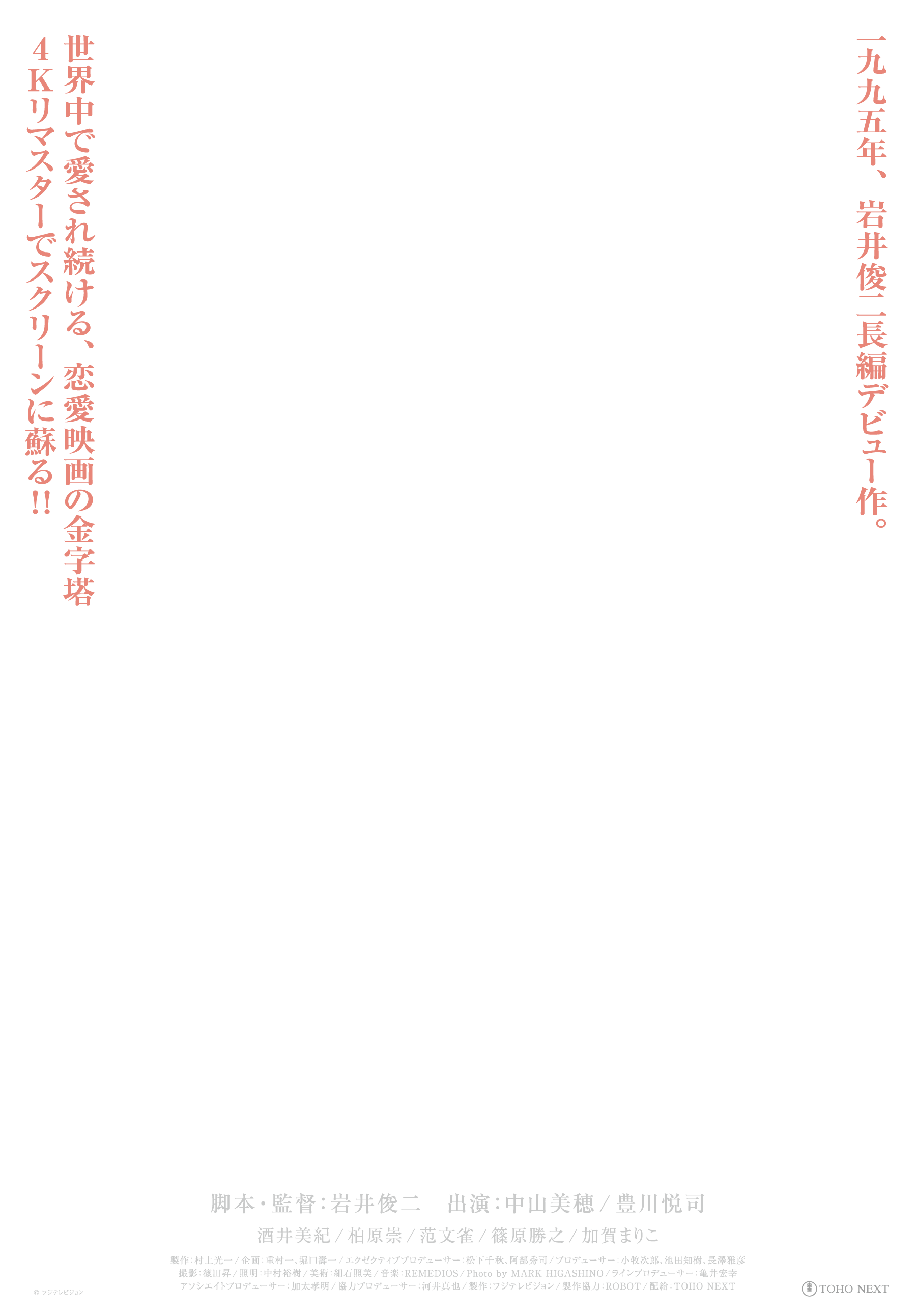 一九九五年、岩井俊二長編デビュー作。 世界中で愛され続ける、恋愛映画の金字塔 4Kリマスターでスクリーンに蘇る!! 脚本・監督:岩井俊二 出演:中山美穂/豊川悦司 酒井美紀/柏原崇/范文雀/篠原勝之/加賀まりこ 製作:村上光一/企画:重村一、堀口壽一/エクゼクティブプロデューサー:松下千秋、阿部秀司/プロデューサー:小牧次郎、池田知樹、長澤雅彦 撮影:篠田昇/照明:中村裕樹/美術:細石照美/音楽:REMEDIOS/Photo by MARK HIGASHINO/ラインプロデューサー:亀井宏幸 アソシエイトプロデューサー:加太孝明/協力プロデューサー:河井真也/製作:フジテレビジョン/製作協力:ROBOT/配給:TOHO NEXT © フジテレビジョン